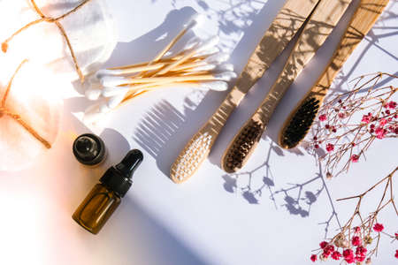 Zero waste. Bathroom accessories, natural brush, wooden comb, oil, makeup remover in a glass container, bamboo toothbrushes. Eco product concept.