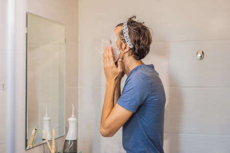Young man doing facial mask sheet. Beauty and Skin Care Concept