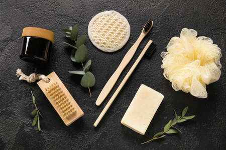 Top view of different hygiene and beauty items on grey background. Eco friendly Zero waste concept.
