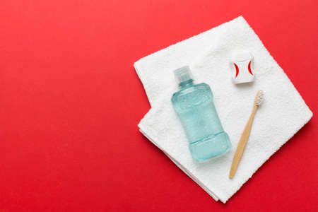 Mouthwash and other oral hygiene products on colored table top view with copy space. flat lay. dental hygiene. Oral care products and space for text on light background. concept.