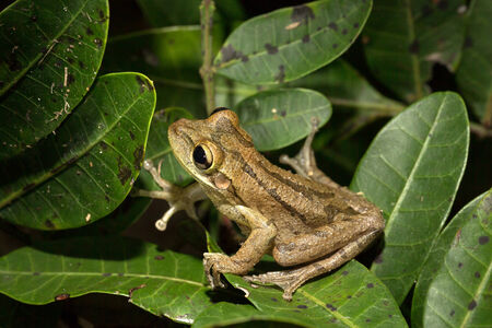 File-eared Tree Frog (Polypedates otilophus, aka Borneo Eared Frog, Bony-headed Flying Frog) on a Leaf. Deramakot Forest Reserve, Sabah Borneo, Malaysia