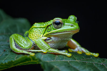 A frog on green plant leaf against a black background with free space for te