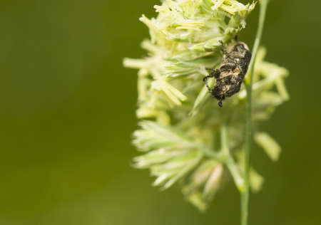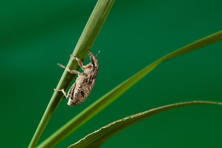 Macro of weevil (Otiorrhynchus sulcatus) climbing on cereal grass stalk