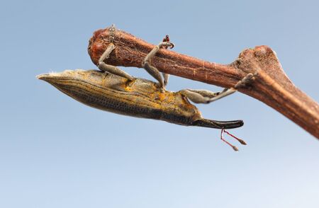 Macro of snouted weevil beetle (Lixus iridis) hidden under tree twig head over heels over blue sky background