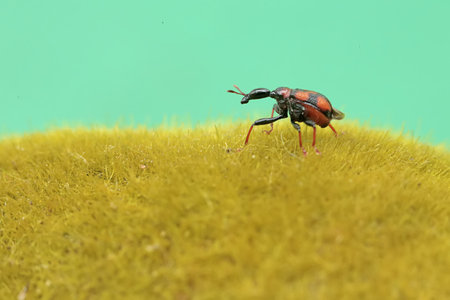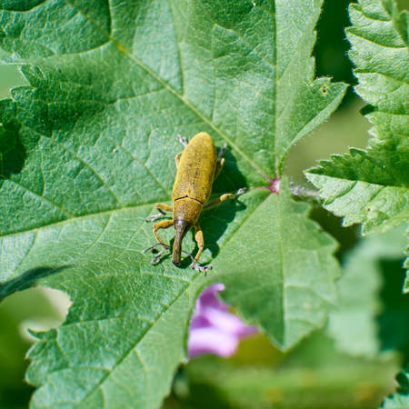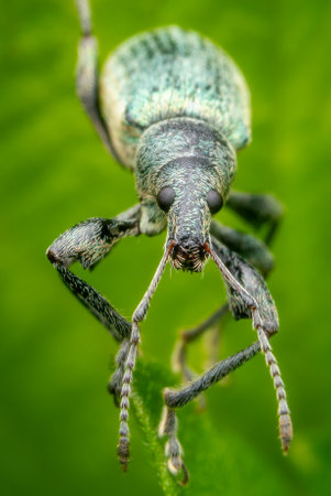 Macro portrait of a Nettle Weevil (Phyllobius pomaceus) with green natural background.