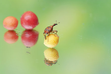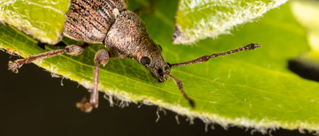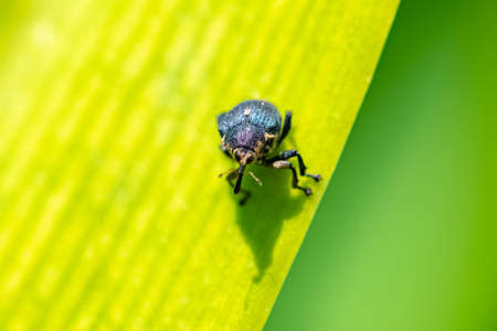 A macro shot of a small European carpophagous weevil, Curculio glandium on a green plant