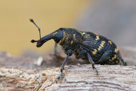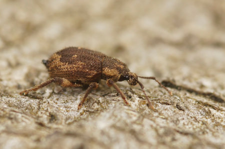 A fascinating brown weevil rests on a rustic log, showing intricate textures and details in soft lighting.