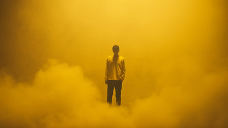 a man stands amidst the smoky atmosphere of an oil tank, creating a minimalist color field. this conceptual installation art piece features soft-focus portraits and atmospheric clouds, evoking immutable perceptions. the monochromatic hues, particularly the dominant yellow, add depth and intensity to the overall composition. ai generated