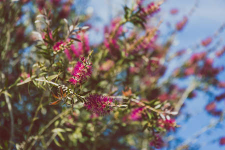 native Australian pink bottlebrush callistemon tree outdoor in sunny backyard shot at shallow depth of field