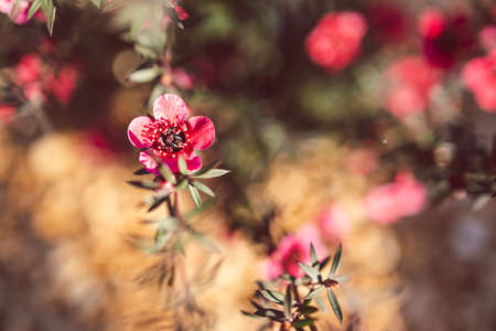 close-up of New Zealand Tea Bush plant with dark leaves and red flowers shot at shallow depth of field