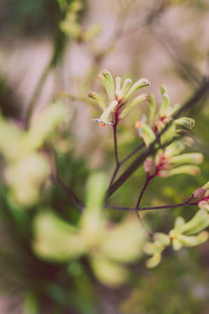 native Australian kangaroo paw plant with green and red flowers outdoor in beautiful tropical backyard shot at shallow depth of field