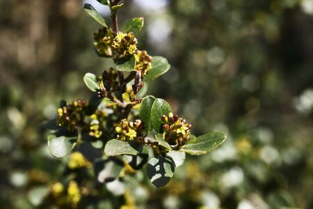 Branch of rhamnus alaternus -Italian buckthorn or Mediterranean buckthorn -with small yellow flowers
