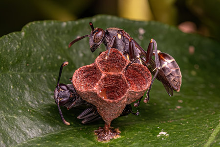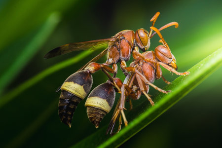 Close-up of two paper wasps mating on a vibrant green leaf, showcasing the intricate details of their bodies and delicate wings