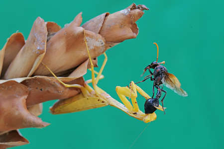 A yellow praying mantis is preying a wasp in a wildflower on a black background. This insect has the scientific name Hierodula sp.