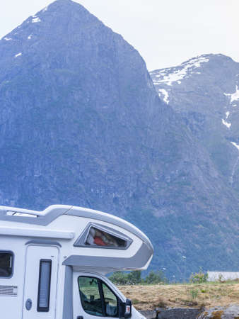 Tourism vacation and travel. Camper van and mountains landscape in Norway