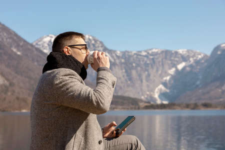 Young adult man sitting outdoors, drinking coffee and enjoying mountains, lake, good weather, blue sky and sun. Beautiful landscape. Time with yourself, dreaming, relaxation, mental health. Holiday.