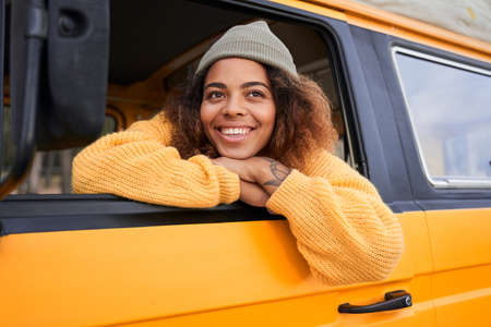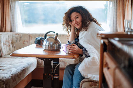 A young woman looks out of the trailer window at summer time