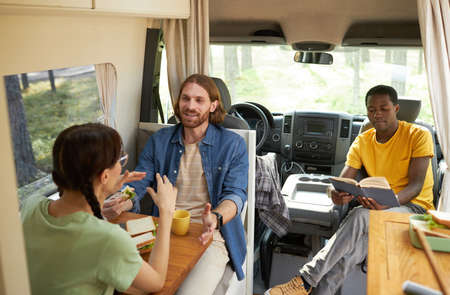 Group of young people having lunch and reading a book while resting in house of wheels during their camping in nature