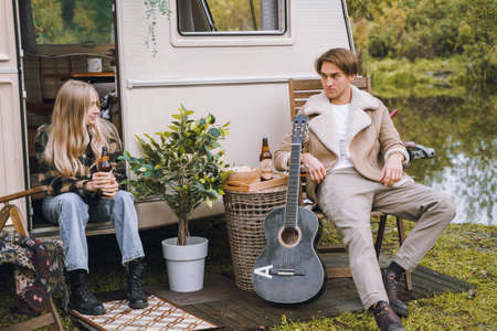 Young just married couple traveling in camper,house on wheels,trailer,motor home.Love romantic road travel,freedom life.Campsite overnight in van.Wanderlust vacation,weekend. girl,guy,happy adventure.