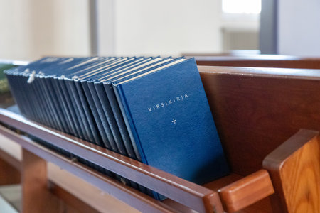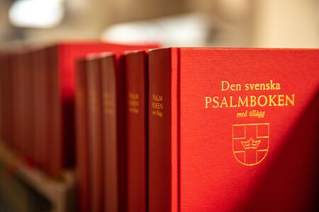 Lulea, Sweden - July 05, 2019: Den svenska Psalms Books in row in Cathedral
