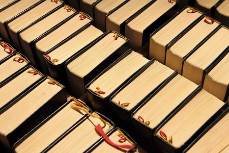 Stack of books with church hymns and verses. Symbol of Christian tradition, devotion, spiritual heritage, and preserved religious literature in sacred life
