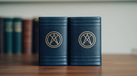 Capture the essence of knowledge with this vintage leather bound book pair featuring a unique symbol, perfect for cozy reading spaces or as decorative items.