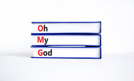 OMG oh my god symbol. Concept words OMG oh my god on books on a beautiful white table, white background. Business and OMG oh my god concept. Copy space.