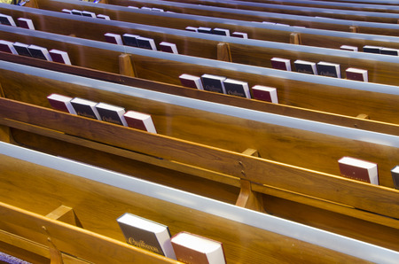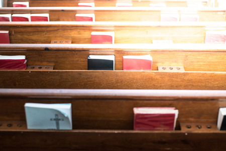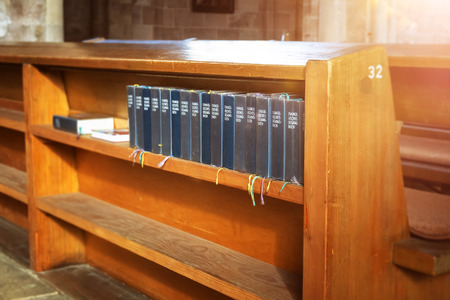 Bibles in wooden bench compartment in church, church service for Christian