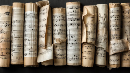 A collection of vintage sheet music rolls displayed on a dark surface, showcasing beautifully aged paper with intricate musical notation and timeless design.
