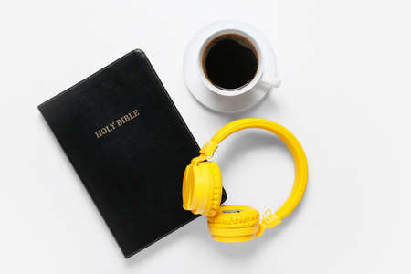 Holy Bible, cup of coffee and modern headphones