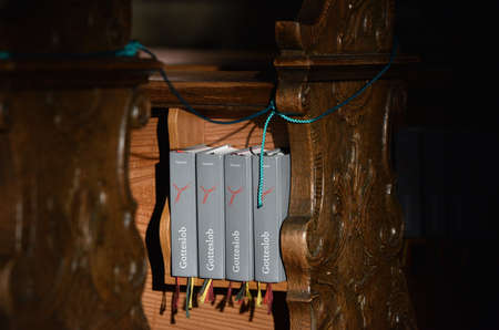 Close up of song books in a catholic church, Austria