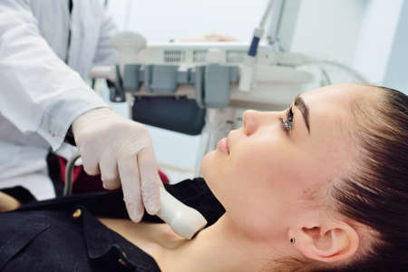 a doctor in a modern diagnostic clinic examines the thyroid gland of a patient of a young attractive woman on an ultrasound machine. Prevention of thyroid cancer.