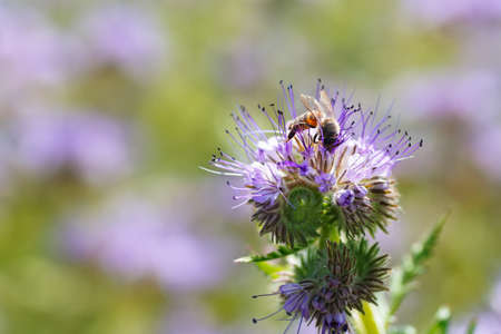 honey bee on flower. Macro photography. Flower of phacelia tanacetifolia or purple tansy with bee closeup. Honey plant. Bee collects nectar