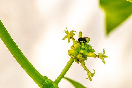 Noni fruit Morinda citrifolia with flowers popular with ants in Playa del Carmen Quintana Roo Mexico.