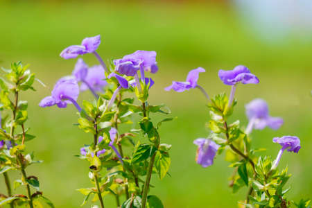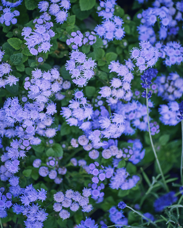 Purple flowers on a green background. Ageratum hirta