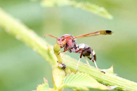 Red paper wasp (polistes dorsalis) (Hymenoptera: Vespidae), close up macro picture front view showing head detail, wings up, on Hercules club blooms (Zanthoxylum clava-herculis)