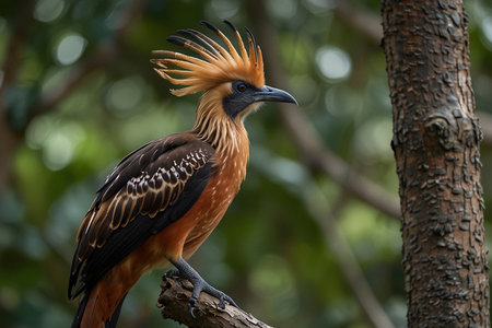 A hoatzin bird displays its unique wild feathers while perched amid green tropical vegetation, showcasing its vibrant appearance against a lush backdrop.