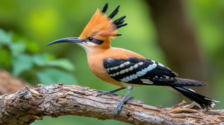 A stunning bird with a vibrant crest perches gracefully on a branch. This close-up captures the bird's intricate feather patterns and colors in a serene natural habitat.