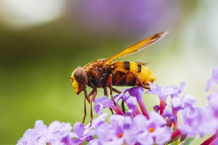Volucella zonaria, the hornet mimic hoverfly, feeding nectar on purple Buddleja davidii flowers