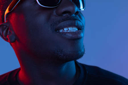 Cropped portrait of young African handsome man posing isolated over dark background in mixed neon light.