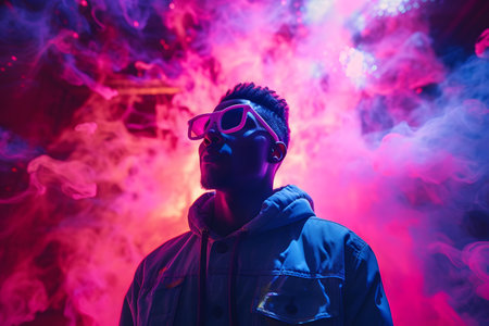 A man stands against a backdrop of radiant graffiti, his silhouette highlighted with bold neon colors. The urban art creates a lively atmosphere rich in creativity and expression.