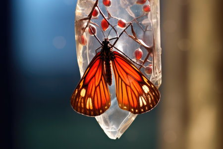 Butterfly emerging from chrysalis after emerging from chrysalis