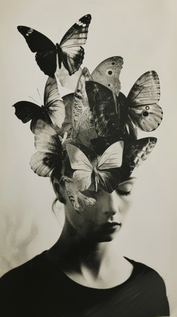 Trendy fashion magazine cover with a woman with butterflies on head and face. Black and white. Modern Art. Generative AI.
