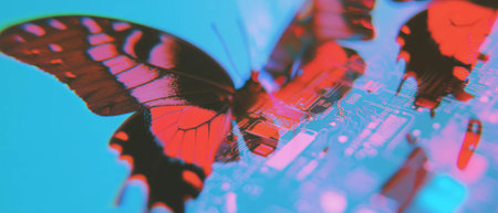 Butterfly wings blend with a circuit board, illustrating the harmony of nature and technology