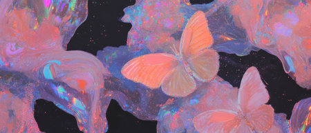 Colorful butterfly clips with glitter and abstract shapes amidst a vibrant background