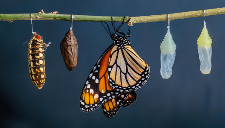 A stunning close-up of a monarch butterfly emerging from its chrysalis, showcasing the beauty of nature and the miracle of metamorphosis in the wild.