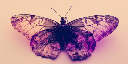 A close-up image of a purple and white butterfly with its wings spread wide, captured against a simple pale pink background.