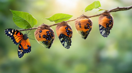 A symmetrically composed image of a butterfly emerging from its chrysalis, backlit by the sun. Two empty cocoons hang on either side, creating a beautiful bokeh background and symbolizing transformation.