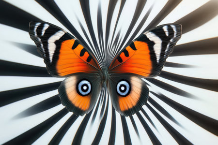 A vibrant butterfly with orange and black wings is perched on a dynamic black and white patterned surface.