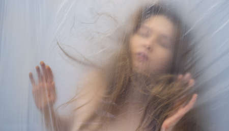 Blurred, out of focus portrait of beautiful sexy sensual seductive woman behind transparent plastic foil like in a dream as background, copy space